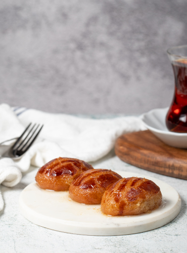 Das runde, saftige Grießgebäck, getränkt in einem feinen, aromatischen Sirup. Ein klassisches Dessert, das durch seine einfache Eleganz besticht und auf der Zunge zergeht.