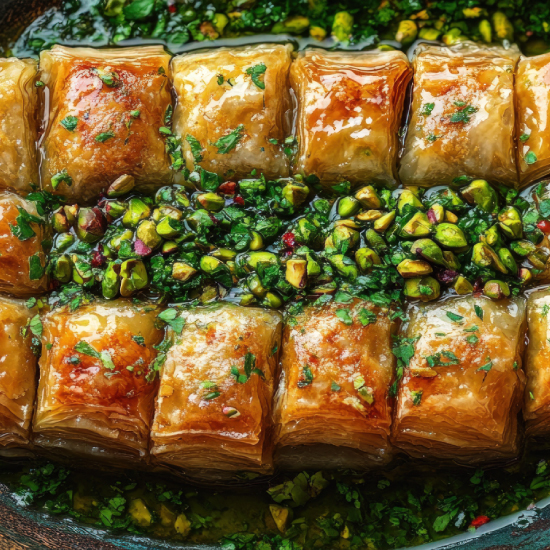 Feiner Blätterteig, gefüllt mit einer Mischung aus Pistazien und einer leichten Kaymak-Creme. Die offene Form erlaubt es, den Sirup perfekt aufzunehmen. Luxuriös und unwiderstehlich.